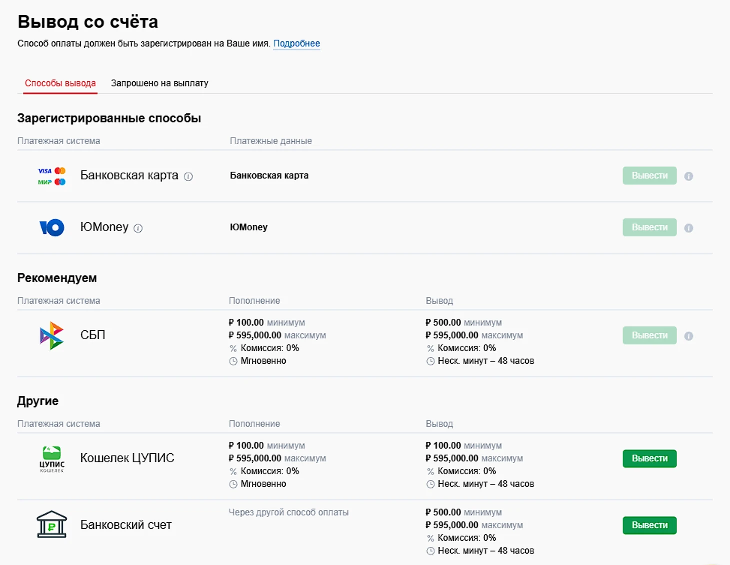 - СБП – минимальная сумма 500, комиссия 0%;