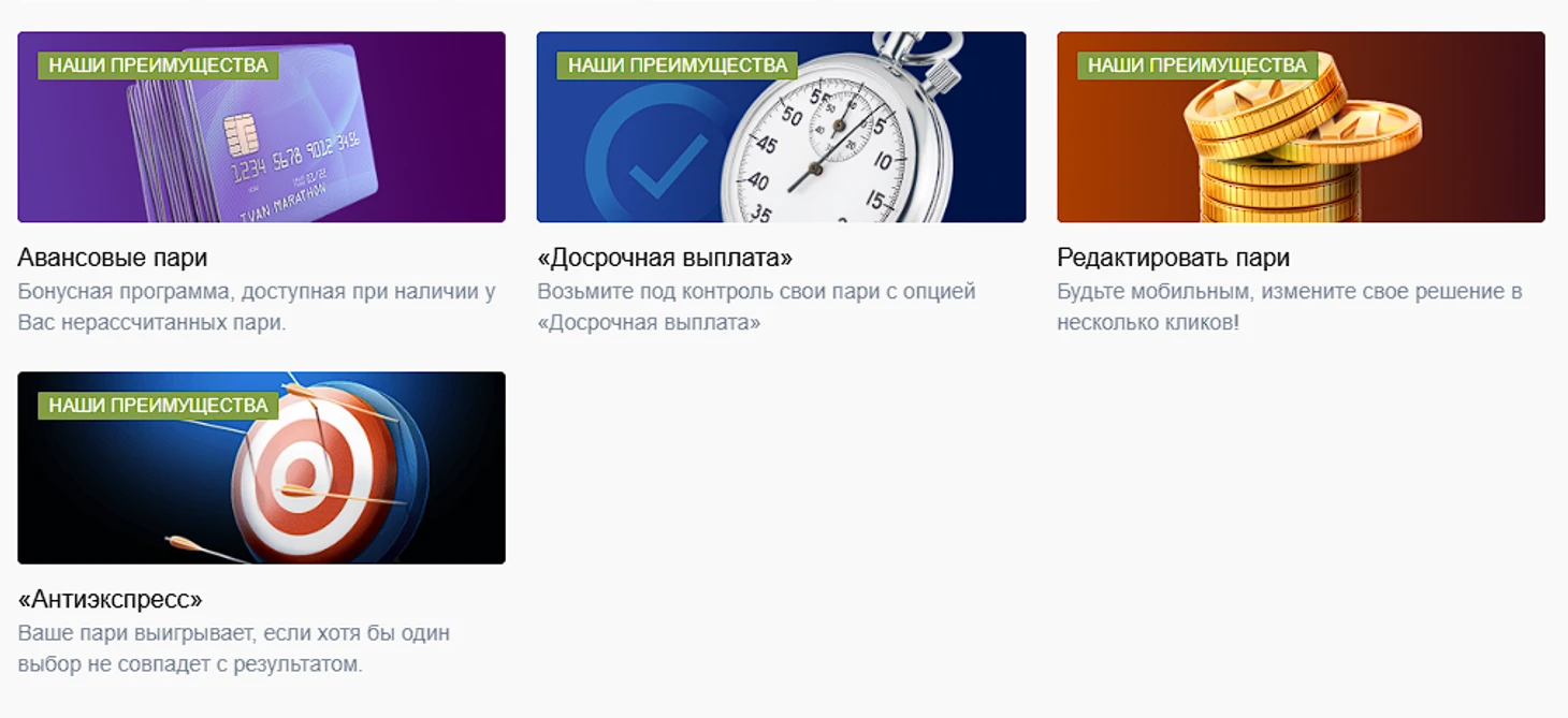 В качестве вознаграждения у букмекера предусмотрены особые условия расчета совершенных ставок. Клиенты могут собрать антиэкспресс, воспользоваться редактором ставки, получить досрочный расчет или заключить пари на авансовые средства, которые могут поступить с ранее совершенных, но еще не рассчитанных пари.