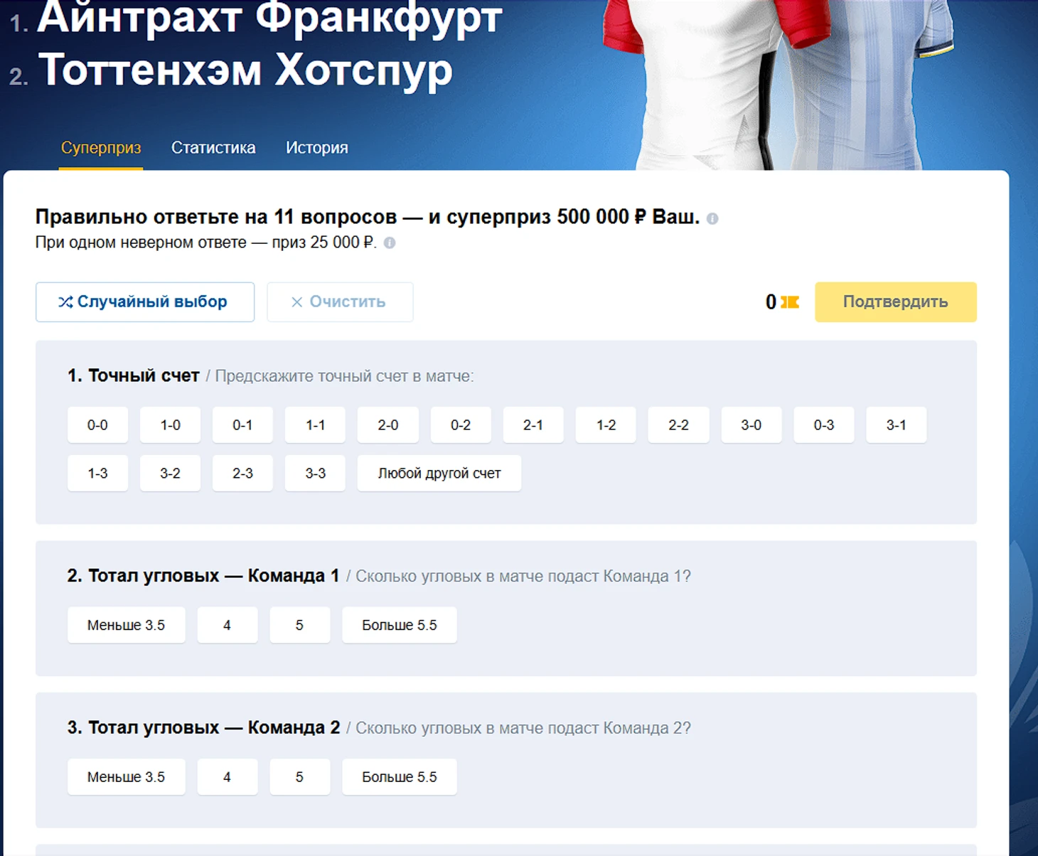 - Суперприз . Это аналог тотализатора, только ставки принимаются на один матч. Клиенту надо ответить на 11 вопросов об игре, если его прогнозы на точный счет, тотал угловых, количество желтых карточек и другие окажутся верными, то выигрыш составит 500 000, при одной ошибке – 25 000. Бонус выплачивается фрибетами. Чтобы участвовать в розыгрыше надо совершить как минимум одну ставку на сумму от 500 рублей. За каждые 500 рублей в пари выдается по одному купону. Можно получить несколько и выбрать разные варианты исходов.