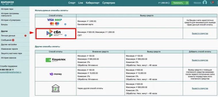 Здесь мы поведаем, какая процедура вывода денег на сайте БК «Марафон» через СБП. Аналогично можно вывести средства на банковскую карту и электронные кошельки ЦУПИС или ЮMoney.